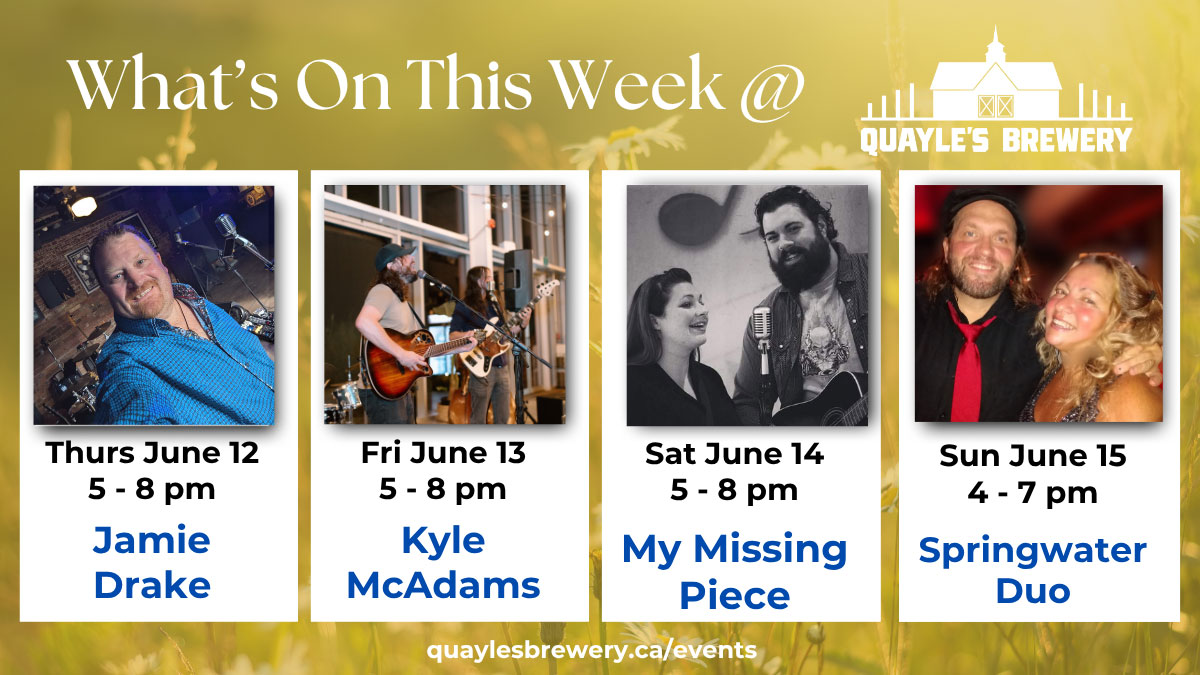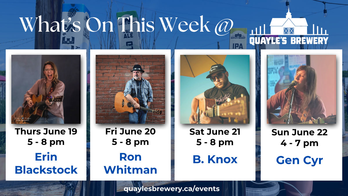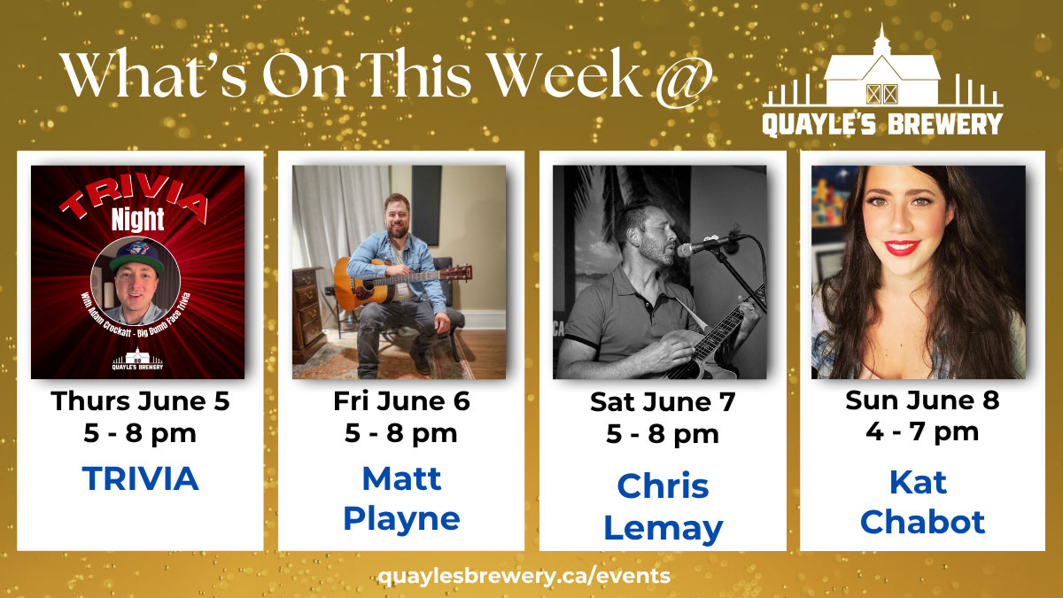Quayle's Brewery 4567 12 Line N, Coldwater, Ontario, CanadaThu May 1 5-8 Trivia Fri May 2 5-8 Michael Dobransky Sat May 3 5-8 Ron Whitman Sun May 4 1-4 Rebekah Hawker