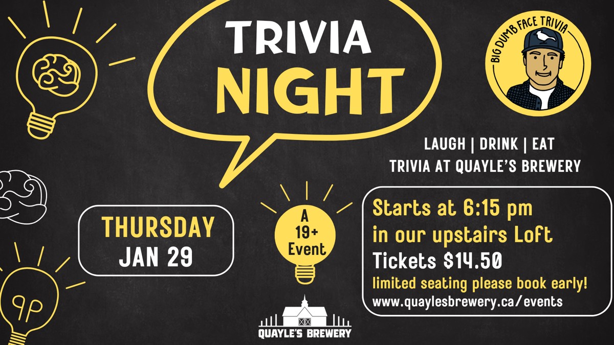 Come join us at Quayle's Brewery for Trivia with Adam Crockatt of Big Dumb Face Trivia. Ticket price includes a FULL pour of beer each, so tickets are less than $5 for an evening of fun!! Tickets are $14.50 plus tax and fees per person Limited seats available per night. Tickets include trivia per person One Full Pour beer from […]