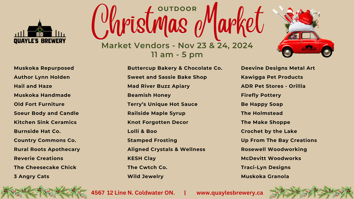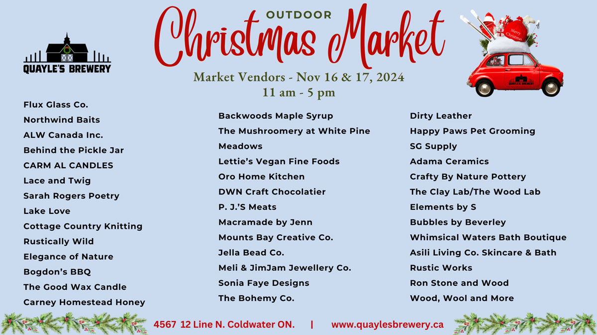 Quayle's Brewery 4567 12 Line N, Coldwater, Ontario, CanadaThu November 14 5-8 Jakob Pearce Fri November 15 5-8 Meredith Warboys Sat November 16 5-8 Ron Whitman Sun November 17 4-7 Shawn Charlebois