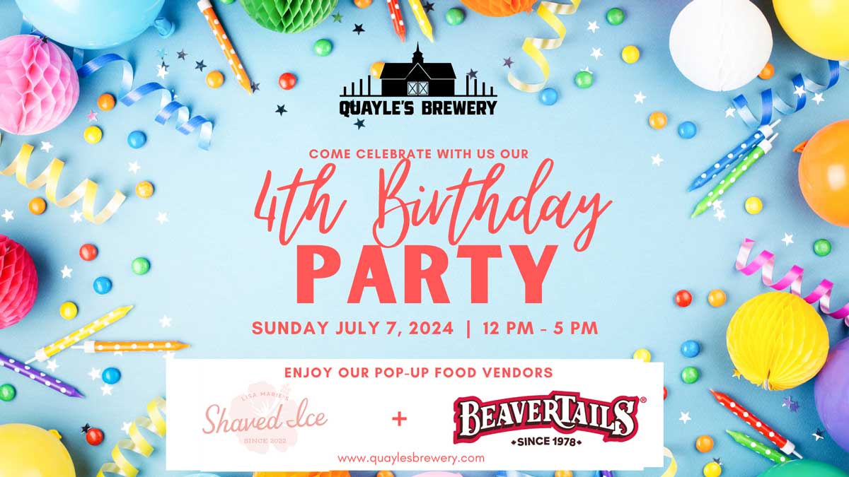 Quayle's Brewery 4567 12 Line N, Coldwater, Ontario, CanadaJoin us to celebrate Quayle's 4th Birthday on Sunday July 7th! Enjoy live tunes, delicious food, and pop-up vendors Beavertails and Lisa Marie's Shaved Ice. Indulge in birthday cake and meet our adorable neighbor baby elks. Bring the family and join us for a day of celebration and memory-making!